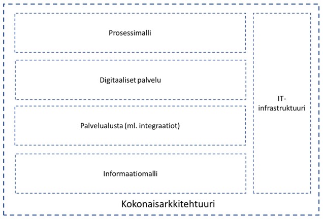 Olemme tehneet Modificassa työtä kokonaisarkkitehtuurin kanssa erityisesti liittyen digitalisaatioon ja digitaalisiin palveluihin. Meidän mallimme lähtee siitä, että sen avulla johdetaan toiminnan ja toimintaa tukevien digitaalisten palvelujen kehittämistä siten, että palveluvaatimukset asettavat vaatimukset myös teknisille asioille.